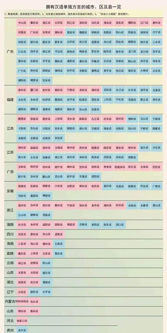 江西江苏广西安徽浙江拥有单独方言的城市,数量也都超过10个。而北方大部分省区,全省只有几个城市有单独方言,而西北五省区则没有一个地方方言。相对来说南方地区方言数量更多,北方因为地形开阔有利于交流,所以不易产生方言。