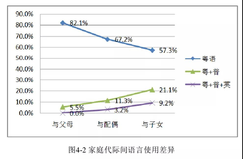 根据2018年《语言竞争中广州人粤语传播调查研究》的调查,在78.28%受访者的母语为单一粤语背景下,家庭内部“仅使用粤语”的比例逐代降低,使用“粤+普”模式的比例逐代上升。