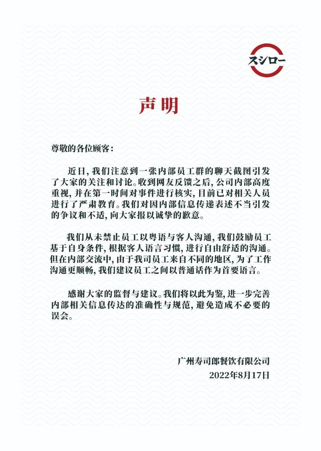 关于“广州寿司郎声明”的声明