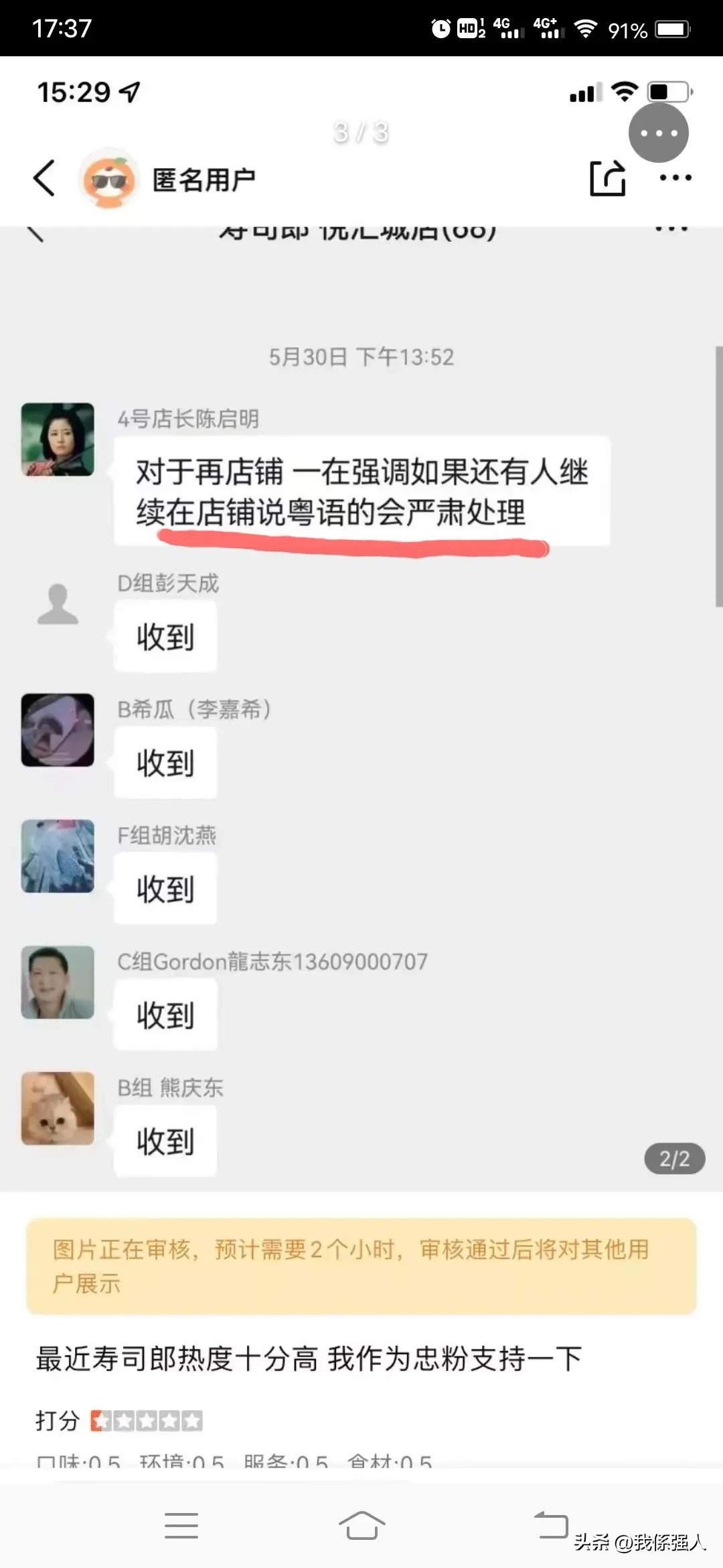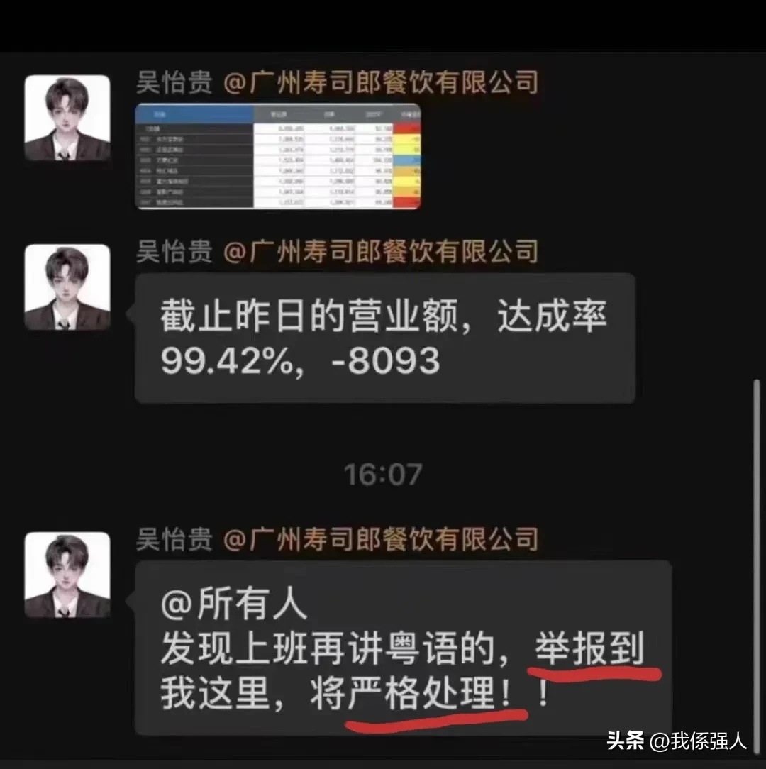 首先,在本来看来,寿司郎这个声明完全是狡辩。规定员工只能说普通话根本就不是仅仅的所谓“建议”,你们公司在内部交流时明明写着“发现、举报甚至严肃处理”讲粤语的员工(如下图)。