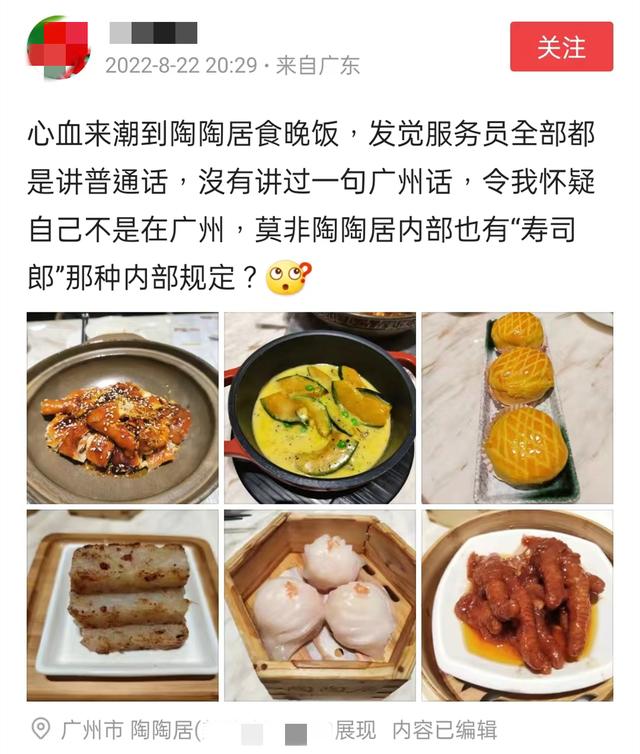 称到广州老字号陶陶居喝茶,发觉服务员全部都是讲普通话,没有讲过一句广州话,令我怀疑自己不是在广州,莫非陶陶居内部也有“寿司郎”那种内部规定?