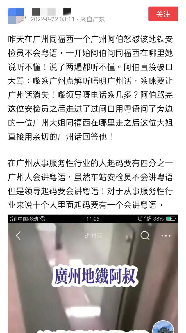 昨天在广州同福西一个广州阿伯怒怼该地铁安检人员不会粤语,随后阿伯直接破口大骂:来广州为什么听不懂广州话,是不是要广州话消失,然后再由一位会听粤语的站员回复阿伯