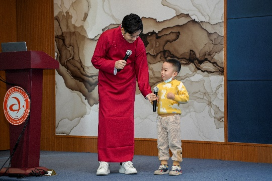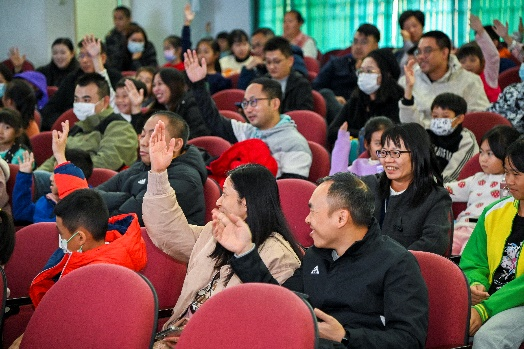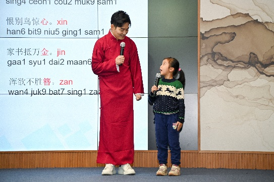 张老师从粤语的历史文化背景、粤语的音调音节、粤语与古汉语的关系等多方面娓娓道来,让大家了解粤语丰富的文化,还带领现场的观众一起用粤语诵读多首诗词,感受粤语在唐诗宋词中的独特魅力。现场的同学和家长积极参与互动,气氛非常活跃。