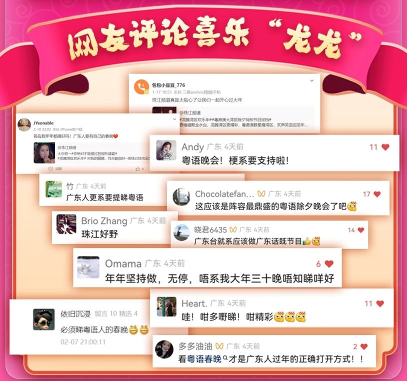 “#7 首旋律一响广东人秒回童年#粤语拜年歌一出春节氛围拉满#广东人除夕夜有自己的粤语节目#BGM 一响广东人的 DNA 动了”等相关热搜话题实力证明“年夜饭”的出圈,这离不开《龙腾湾区欢乐年》制作团队对岭南特色和湾区文化的挖掘,不仅大胆创新、超越自己,更在情怀浓度、湾区温度、艺术厚度、技术高度上突破,交出一份突出粤港澳民众同声同气、血脉相通、共筑美好未来的答卷。