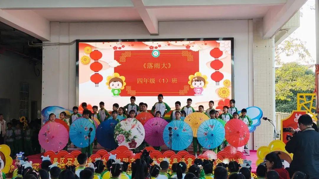 学校太阳花合唱团带来经典粤语童谣《月光光》,把大家带回儿时美好的回忆;四年级一班带来表演《落雨大》,雨伞在雨中争相开放,仿佛春天百花齐放的景象,把广东雨天的美景展现得淋漓尽致;六年级一班唱响新年歌曲《欢乐年年》,为全场人员送上热烈的新年祝福。