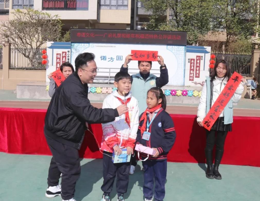 在新春佳节来临之际,主持人出示了两幅对联,引导学生学习用粤语送上新春祝福并且送上精心准备的小礼品。现场热闹非凡,同学们热情高涨,在粤语的奇妙世界里开启了一场欢乐的贺岁之旅。为了让同学们更好地掌握粤语发音,钟校长还亲自下场与孩子们互动,巧妙地将粤语与同学们日常学习到的粤语知识相结合,生动形象地示范每个音节的发音方法,同学们纷纷模仿,大家在轻松愉快的氛围中迈出了学习粤语的第一步。