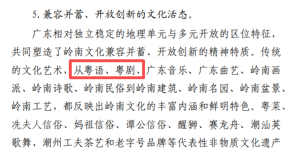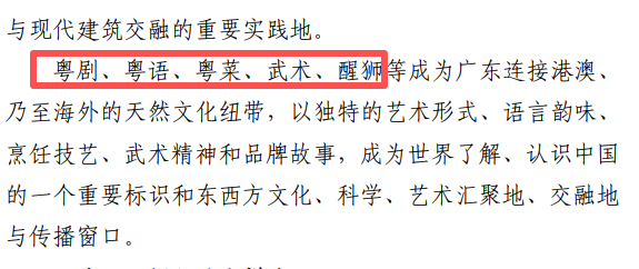 规划意见稿中提出:粤剧、粤语、粤菜、武术、醒狮等成为广东连接港澳、乃至海外的天然文化纽带,以独特的艺术形式、语言韵味、烹饪技艺、武术精神和品牌故事,成为世界了解、认识中国的一个重要标识和东西方文化、科学、艺术汇聚地、交融地与传播窗口。