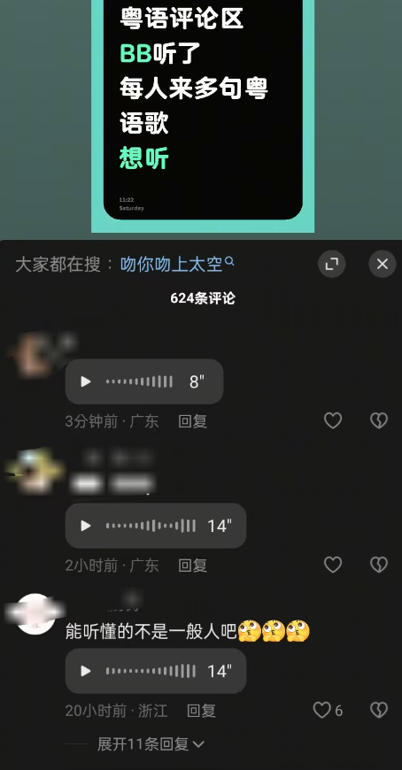 “唱首《海阔天空》听听咯!”、“来段《千千阙歌》好不好?”最近,抖音平台推出的语音评论功能,意外引发了一场粤语音乐盛宴。随着语音评论功能的推出,不少外省网友在听到两广老表们的粤语语音后,纷纷邀请他们一展歌喉,唱起经典的粤语歌曲。