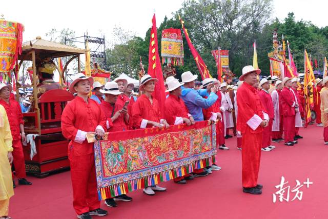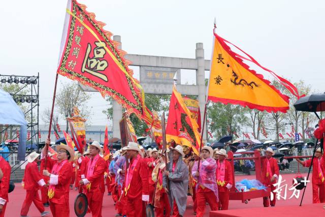 当日上午8时左右,南海神庙南广场便陆续有游客来到,雨水把广场周围的古树冲刷得更显青翠。随着人流愈发密集,锣鼓声也愈发响亮,彩旗迎风招展。