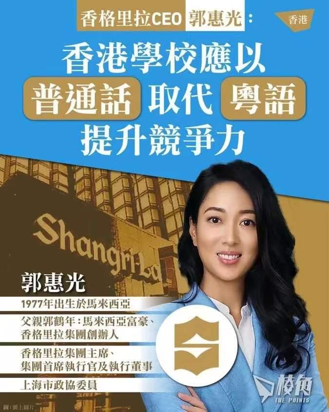 在相关宣传图中,郭惠光身着正装,面带微笑,背景为蓝色调并带有香格里拉集团标识。图片文字突出了她的身份与核心观点:“香港学校应以普通话取代粤语提升竞争力”。