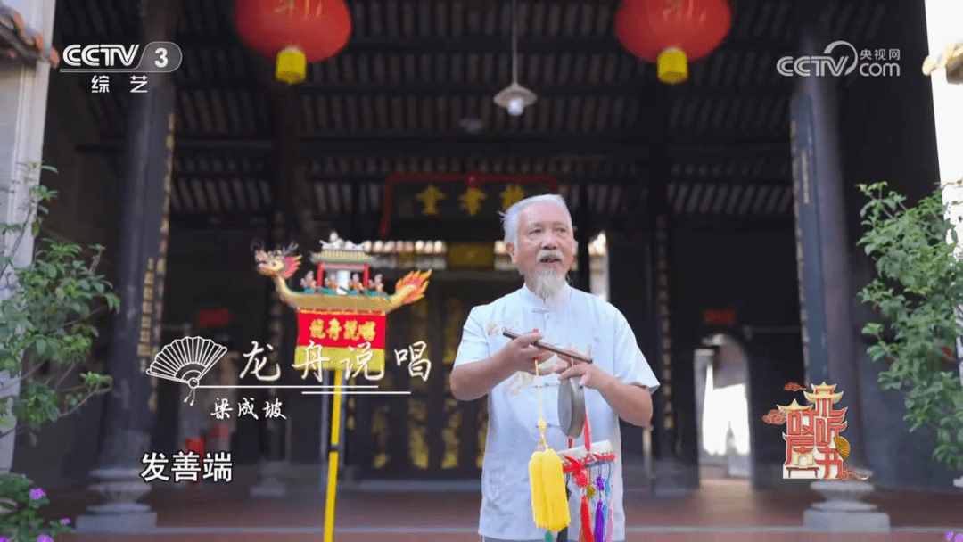 节目中,龙舟说唱非遗传承人梁成坡带来一曲《德艺双馨话叶问》。据了解,龙舟说唱作为一种说唱艺术,来源于民间,是粤语曲艺的一个曲种,目前在西樵、丹灶、里水都有保护传承。