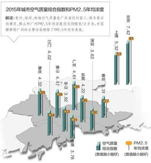 尽管肇庆、佛山与广州的P M 2 .5浓度相当,但就整体的空气质量而言,广州综合指数仍排在肇庆和佛山之后。