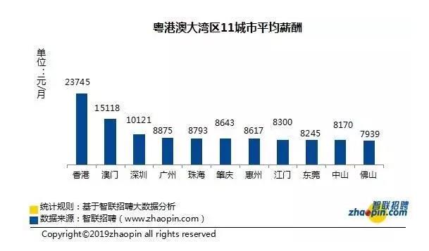 别急!大家别忘了在大湾区这个“圈子”里,有一位经济领跑的“老大哥”:香港。粤港澳大湾区由香港、澳门两个特别行政区和珠三角九市(包括广州市、深圳市、珠海市、佛山市、惠州市、东莞市、中山市、江门市、肇庆市)组成。其中,经济最发达的香港平均薪酬为23745元/月,比平均数高出一倍不止!