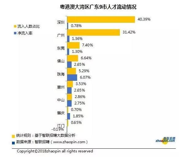 粤港澳大湾区广东9市中,深圳和广州作为两大核心城市,担当着人才流动中心的角色,从外界流入湾区的人才有40.39%都流向深圳,31.42%流向广州,两者占到7成以上。