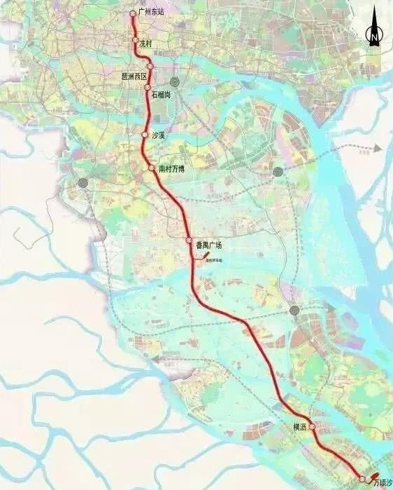 根据规划,广州18号线全长62.5km,起点广州东站,自北向南经过冼村、琶洲西区、石榴岗、沙溪、南村万博、番禺广场、横沥、万顷沙9座车站,贯穿天河、海珠、番禺、南沙四大区域。