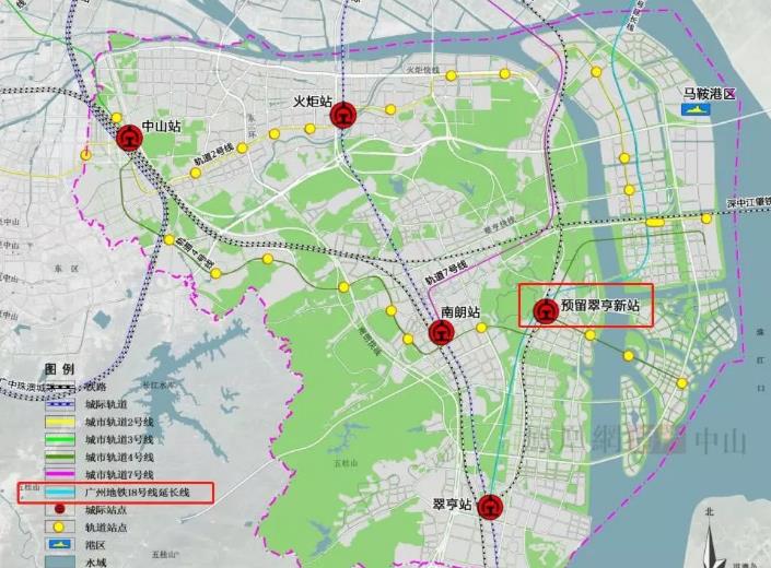在此前中山公布的三个关于东部组团规划的文件中,便预留了翠亨新站,其未来将与广州地铁18号线连接。