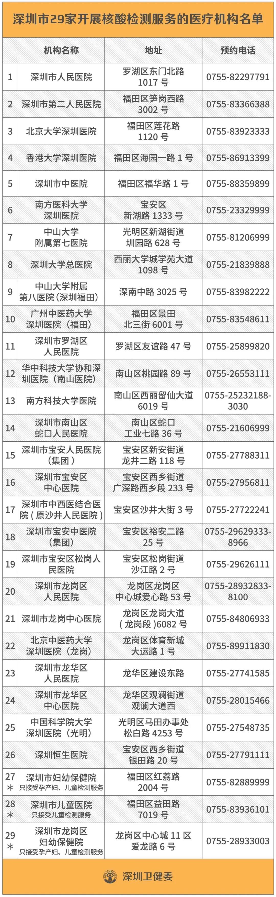 3.目前,深圳已有29家医院面向个人提供新冠病毒核酸检测服务,大家如有需要,可以近期提前前往检测,并准备好检测结果证明。