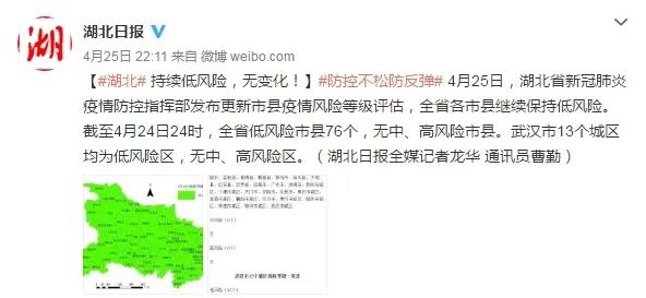 据湖北日报消息,4月25日,湖北省新冠肺炎疫情防控指挥部发布更新市县疫情风险等级评估,全省各市县继续保持低风险。